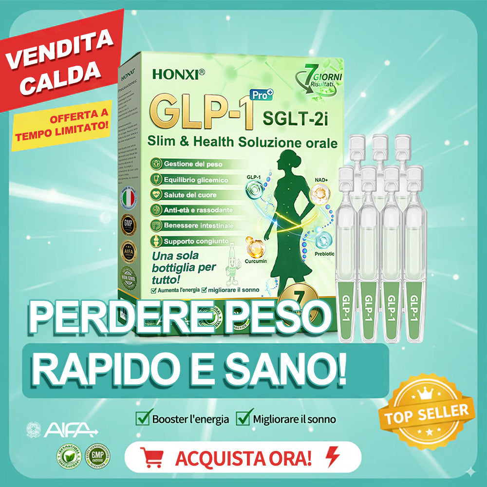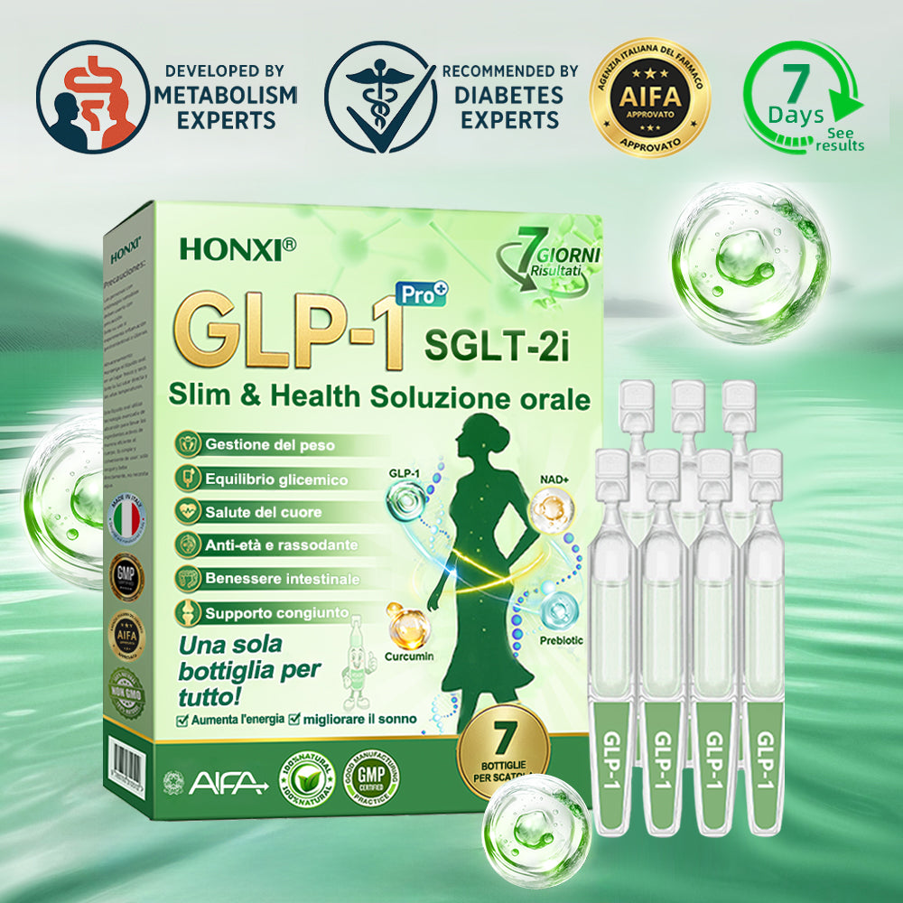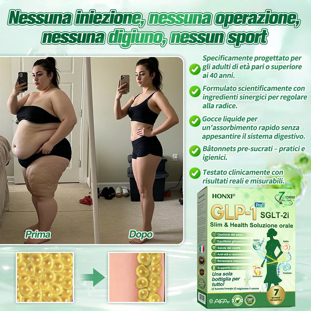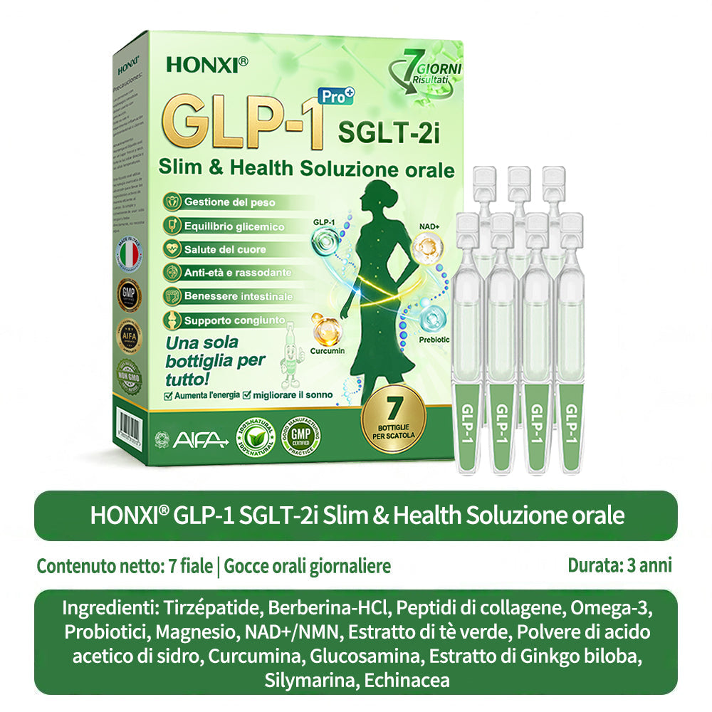 Honxiยฎ GLP-1 + SGLT-2i slim & health Soluzione Orale, sviluppata da oltre 20 anni di ricerca da piรน di 30 esperti, รจ pensata per adulti di mezza etร e anziani. Combina Tirzepatide (GLP-1) con estratti naturali per bilanciare la glicemia, controllare lโappetito e bruciare grassi per una perdita di peso graduale e sana. Con Peptidi di Collagene aggiunti, supporta la compattezza della pelle durante il dimagrimento. Prodotto in strutture certificate GMP secondo gli standard italiani ed europei, fornisce una soluzione sicura, scientificamente supportata, senza aghi, per una gestione efficace del peso e della salute duratura.