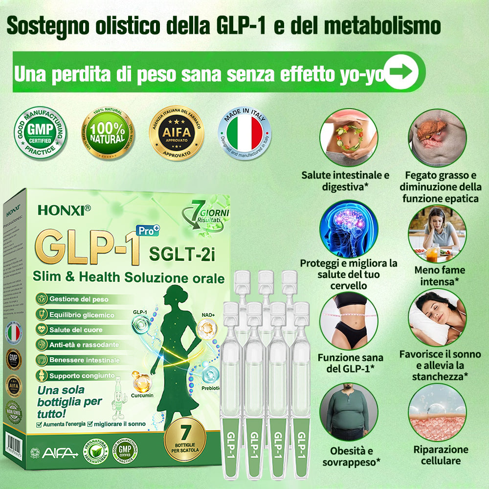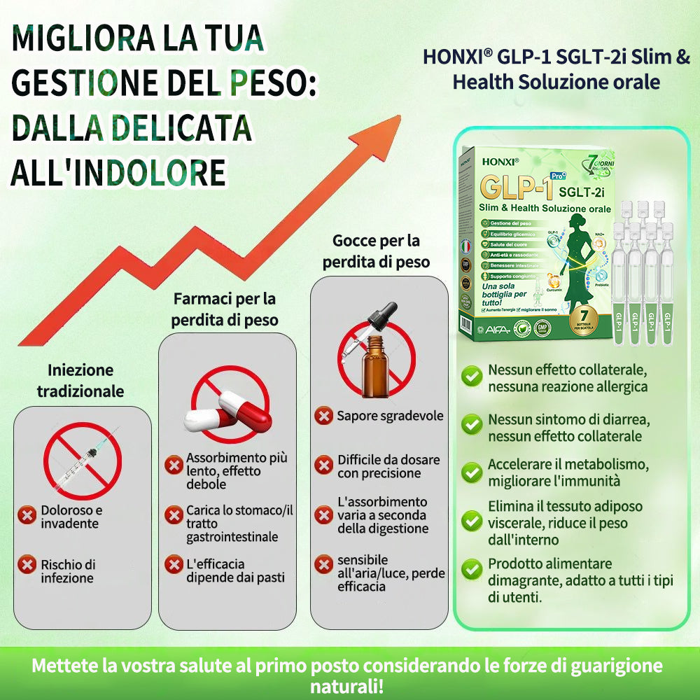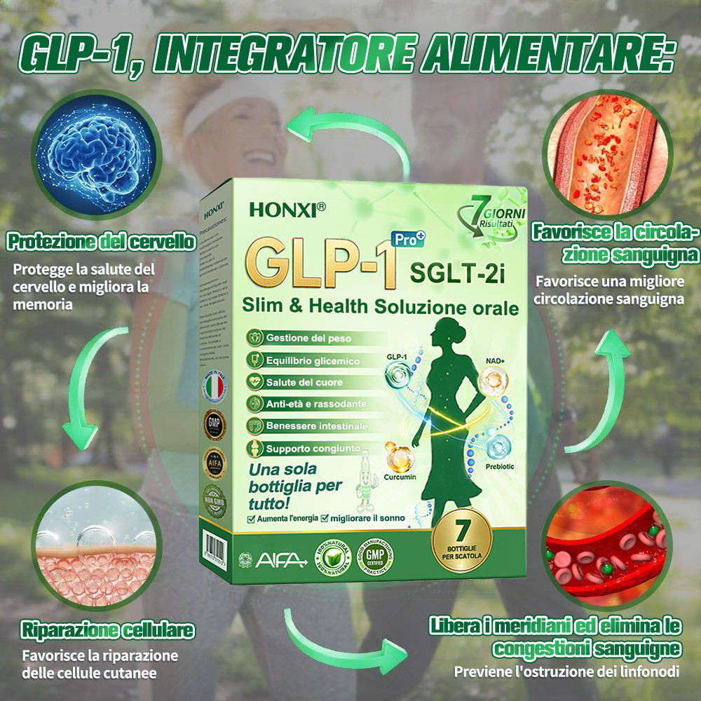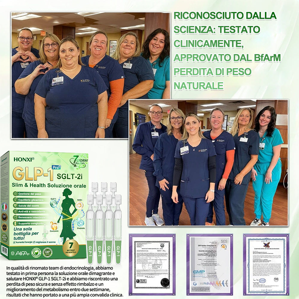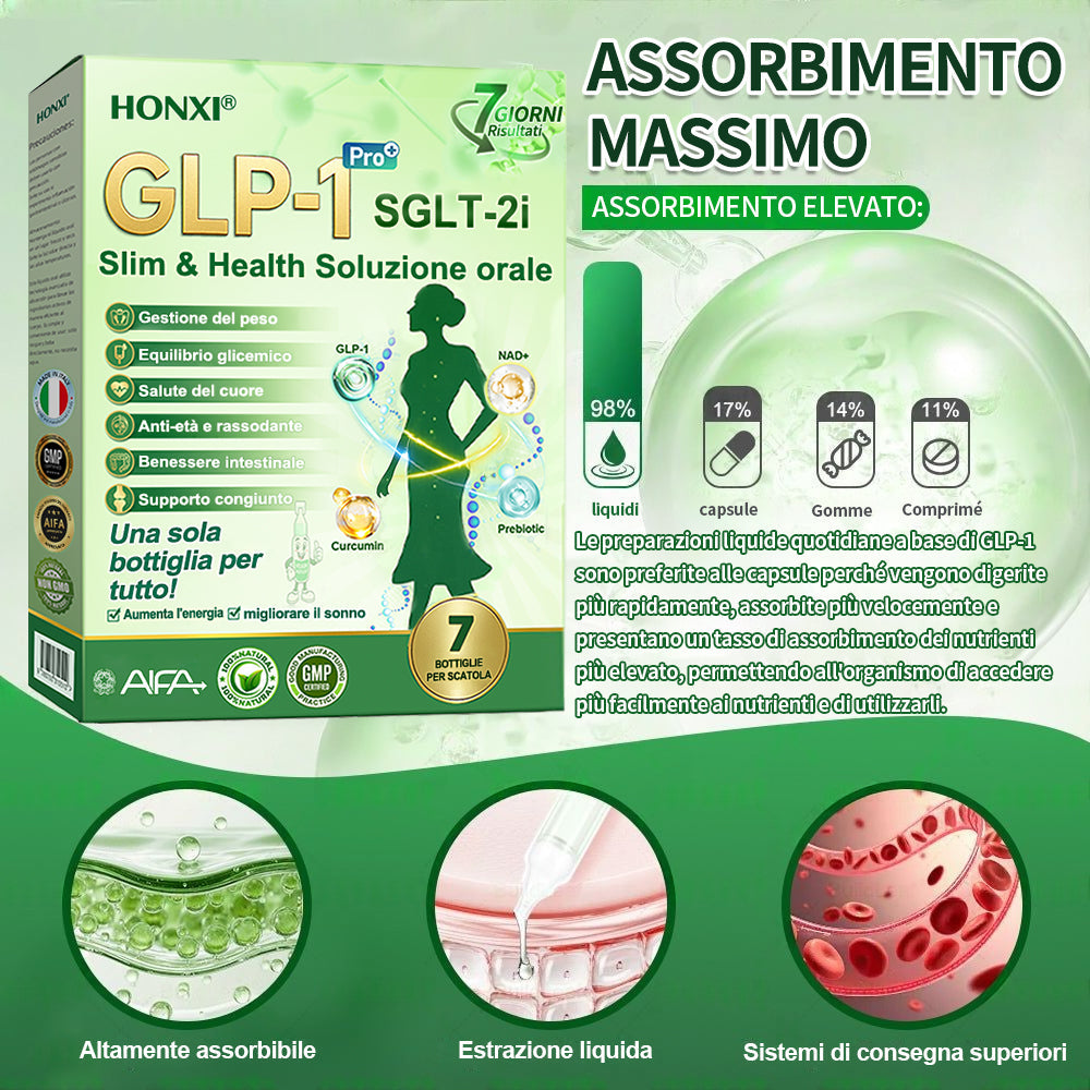 Honxiยฎ GLP-1 + SGLT-2i slim & health Soluzione Orale, sviluppata da oltre 20 anni di ricerca da piรน di 30 esperti, รจ pensata per adulti di mezza etร e anziani. Combina Tirzepatide (GLP-1) con estratti naturali per bilanciare la glicemia, controllare lโappetito e bruciare grassi per una perdita di peso graduale e sana. Con Peptidi di Collagene aggiunti, supporta la compattezza della pelle durante il dimagrimento. Prodotto in strutture certificate GMP secondo gli standard italiani ed europei, fornisce una soluzione sicura, scientificamente supportata, senza aghi, per una gestione efficace del peso e della salute duratura.