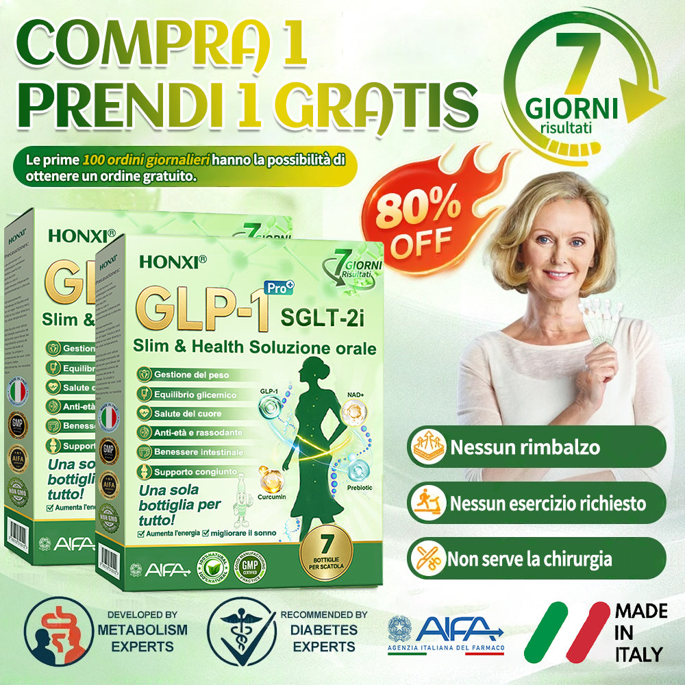 Supportata dalla ricerca medica moderna, Honxiยฎ GLP-1 + SGLT-2i slim & health Soluzione Orale ha superato la rigorosa revisione regolatoria e la certificazione AIFA, con efficacia e conformitร ufficialmente validate. Rappresenta una scelta affidabile e scientificamente supportata, particolarmente indicata per chi cerca un approccio naturale, sicuro ed efficace alla gestione del peso e al supporto completo della salute.