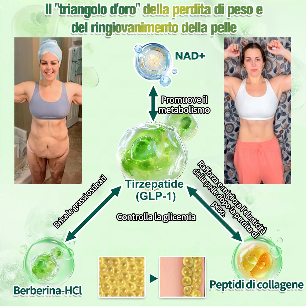 Tirzepatide (GLP-1) imita lโormone GLP-1 naturale del corpo, aiutando a regolare la glicemia, sopprimere lโappetito e rallentare lo svuotamento gastrico per ridurre lโassorbimento calorico.ย Berberine HCl aumenta la sensibilitร allโinsulina e stabilizza i livelli di zucchero nel sangue, riducendo il rischio di diabete di tipo 2.